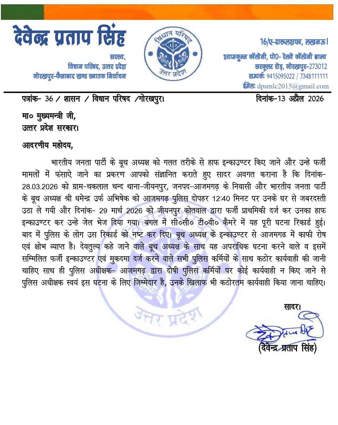 चिट्ठी के मुताबिक, 28 मार्च 2026 को Azamgarh के जीयनपुर थाना क्षेत्र के निवासी अभिषेक सिंह (उर्फ धर्मेंद्र) को पुलिस ने दोपहर करीब 12:40 बजे उनके घर से उठाया। आरोप है कि इसके बाद 29 मार्च को पुलिस ने उनके खिलाफ फर्जी केस दर्ज कर ‘हाफ एनकाउंटर’ दिखाते हुए जेल भेज दिया।