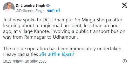 केंद्रीय मंत्री Jitendra Singh ने इस हादसे की जानकारी सोशल मीडिया पोस्ट के जरिए दी। उन्होंने बताया कि उन्होंने उधमपुर के डीसी Minga Sherpa से बात की है और पूरे घटनाक्रम की जानकारी ली है। उन्होंने कहा कि हादसे की सूचना मिलते ही मौके पर तुरंत रेस्क्यू ऑपरेशन शुरू कर दिया गया। बड़ी संख्या में लोगों के हताहत होने की आशंका को देखते हुए हर संभव मदद पहुंचाई जा रही है।