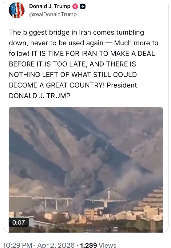 डोनाल्ड ट्रंप द्वारा सोशल मीडिया पर शेयर किए गए वीडियो में हमले के बाद पुल में आग लगती और घना धुआं उठता दिखाई दे रहा है। ट्रंप ने चेतावनी देते हुए कहा कि अगर ईरान ने अपना रवैया नहीं बदला, तो उसे भारी नुकसान उठाना पड़ सकता है। उन्होंने यह भी कहा, “और उस देश का कुछ भी बाकी नहीं बचेगा, जो अब भी एक महान देश बन सकता था!”