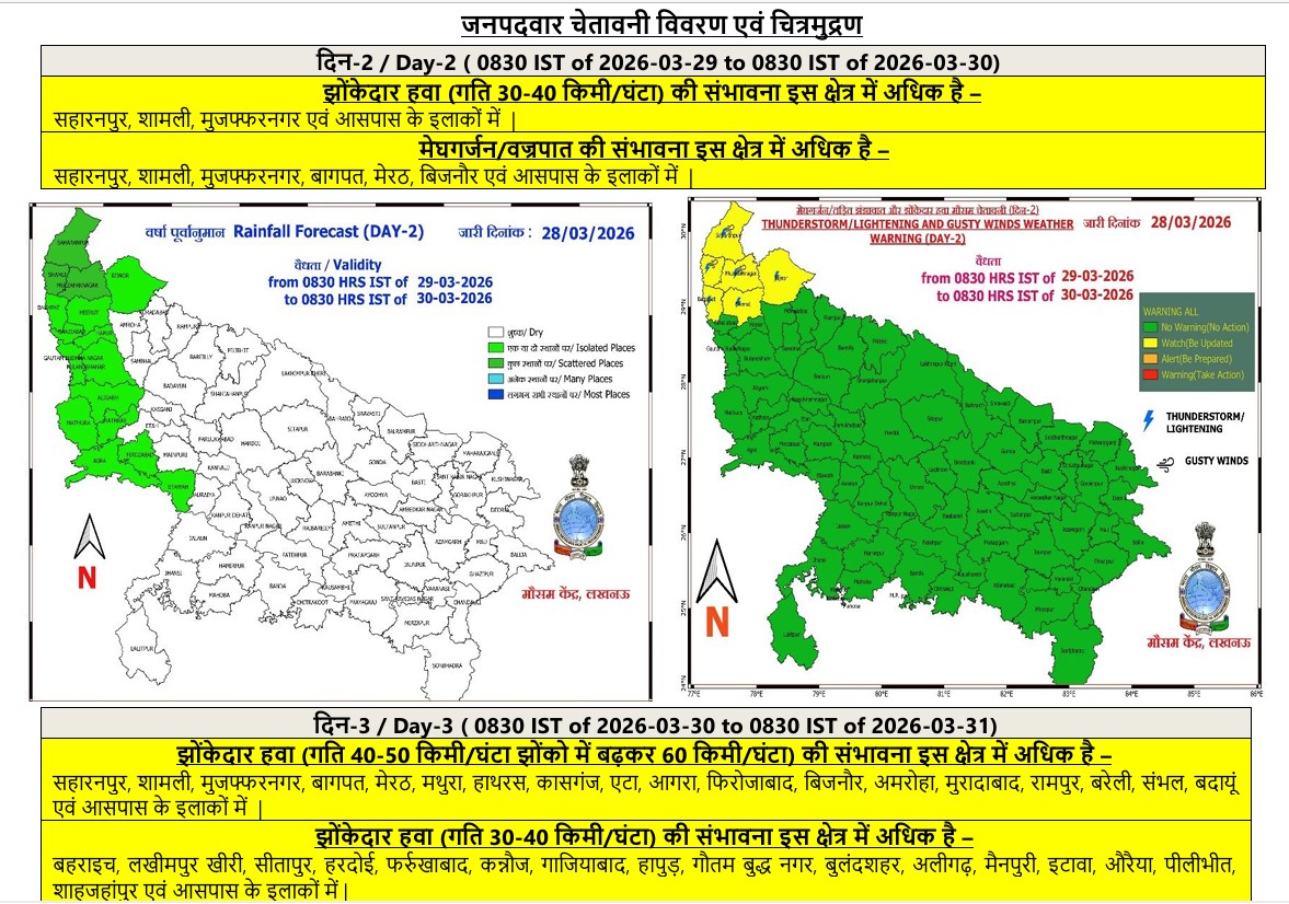 पश्चिमी उत्तर प्रदेश के जिलों—सहारनपुर, मेरठ, मुजफ्फरनगर—में यह असर पहले दिखेगा, जबकि 30 और 31 मार्च को लखनऊ, कानपुर, बरेली और आसपास के क्षेत्रों में भी तेज गतिविधि की संभावना है।