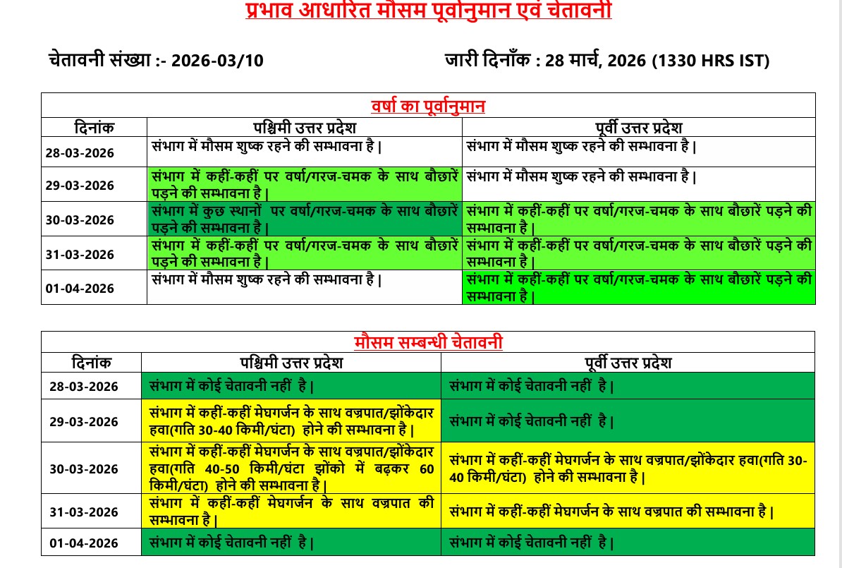 IMD के पूर्वानुमान के अनुसार, 28 मार्च तक प्रदेश में मौसम शुष्क बना रहेगा, लेकिन 29 मार्च की देर शाम से पश्चिमी उत्तर प्रदेश में हल्की बारिश और गरज-चमक की शुरुआत होगी।